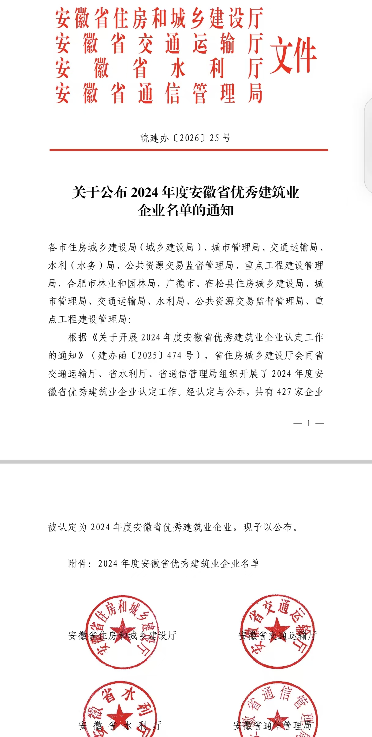 喜報:淮南建發(fā)檢測公司榮獲2024年度安徽省優(yōu)秀建筑業(yè)企業(yè)(工程質(zhì)量檢測類)榮譽(yù)稱號!